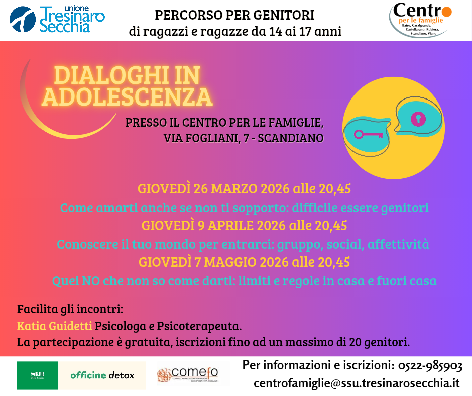 Il Centro per le famiglie dell'Unione Tresinaro Secchia propone in anteprima “Dialoghi in adolescenza”, iniziativa rivolta ai genitori di ragazzi e ragazze tra i 14 e i 17 anni che desiderano confrontarsi circa la sfida di crescere figli adolescenti nel mondo di oggi.
