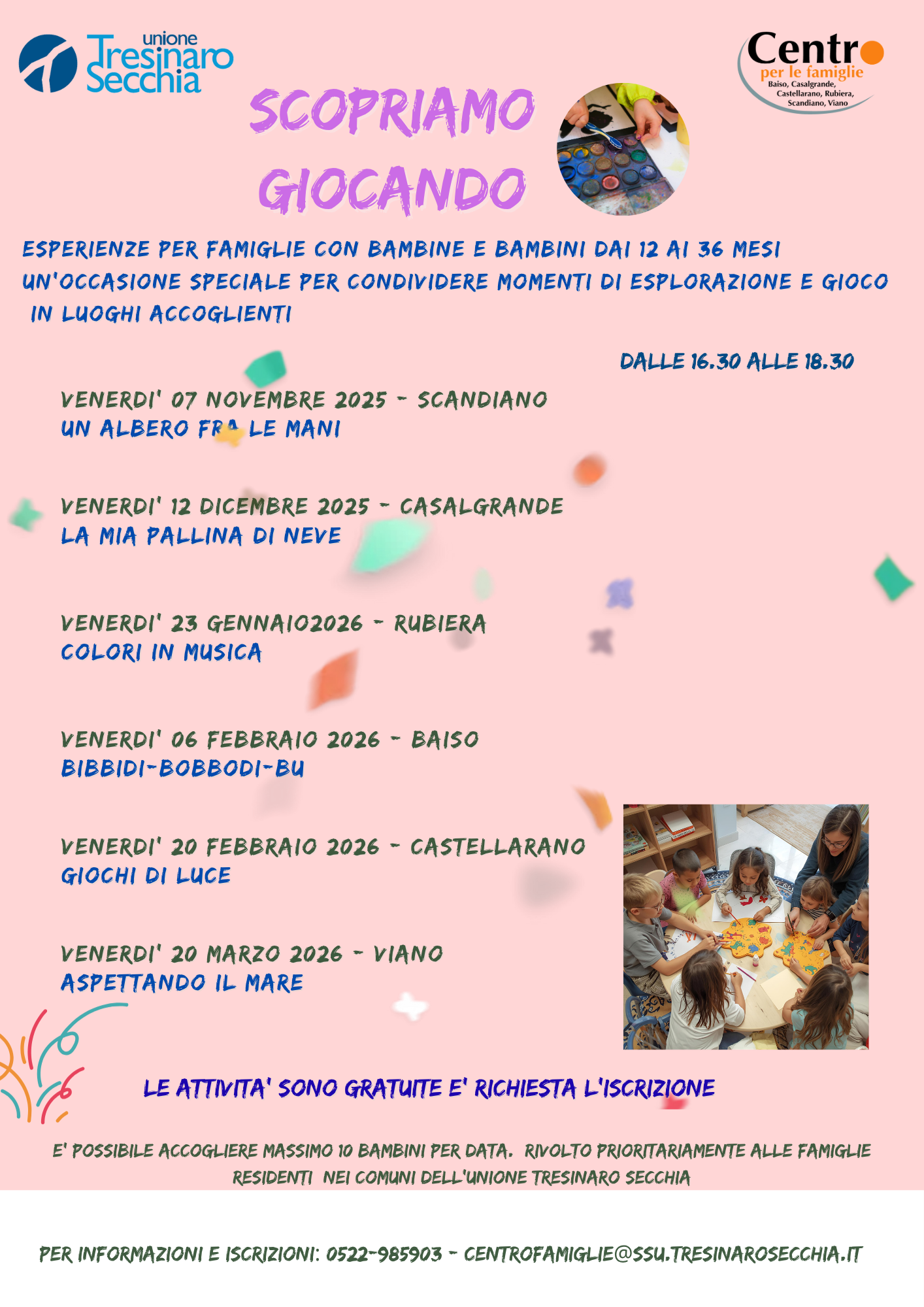 Sei genitore, nonno o babysitter di un bambino o una bambina tra i 12 e i 36 mesi? Il Centro per le famiglie dell'Unione Tresinaro Secchia ti aspetta ai laboratori di 'Scopriamo Giocando', un'occasione per valorizzare il momento del gioco insieme al tuo bambino. Sei incontri (gratuiti) il venerdì pomeriggio dalle 16.30 alle 18.30 dal 7 novembre al 20 marzo in tutti e sei i comuni dell'Unione Tresinaro Secchia, ai cui residenti è rivolta prioritariamente l'iniziativa. Per informazioni e iscrizioni ☎ 0522.985903 o scrivere alla mail centrofamiglie@ssu.tresinarosecchia.it.