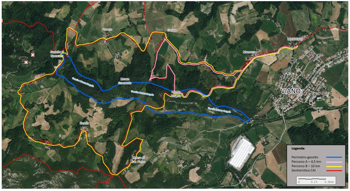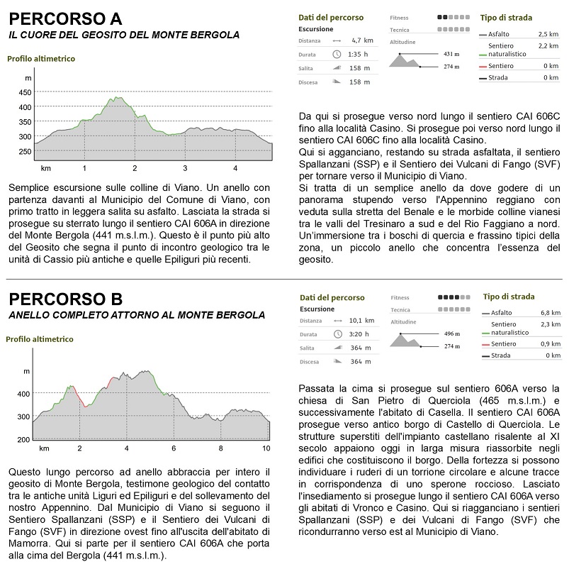 Semplice escursione sulle colline di Viano. Un anello con partenza davanti al Municipio del Comune di Viano, con primo tratto in leggera salita su asfalto. Lasciata la strada si prosegue su sterrato lungo il sentiero CAI 606A in direzione del Monte Bergola (441 m.s.l.m.). Questo è il punto più alto del Geosito che segna il punto di incontro geologico tra le unità di Cassio più antiche e quelle Epiliguri più recenti.