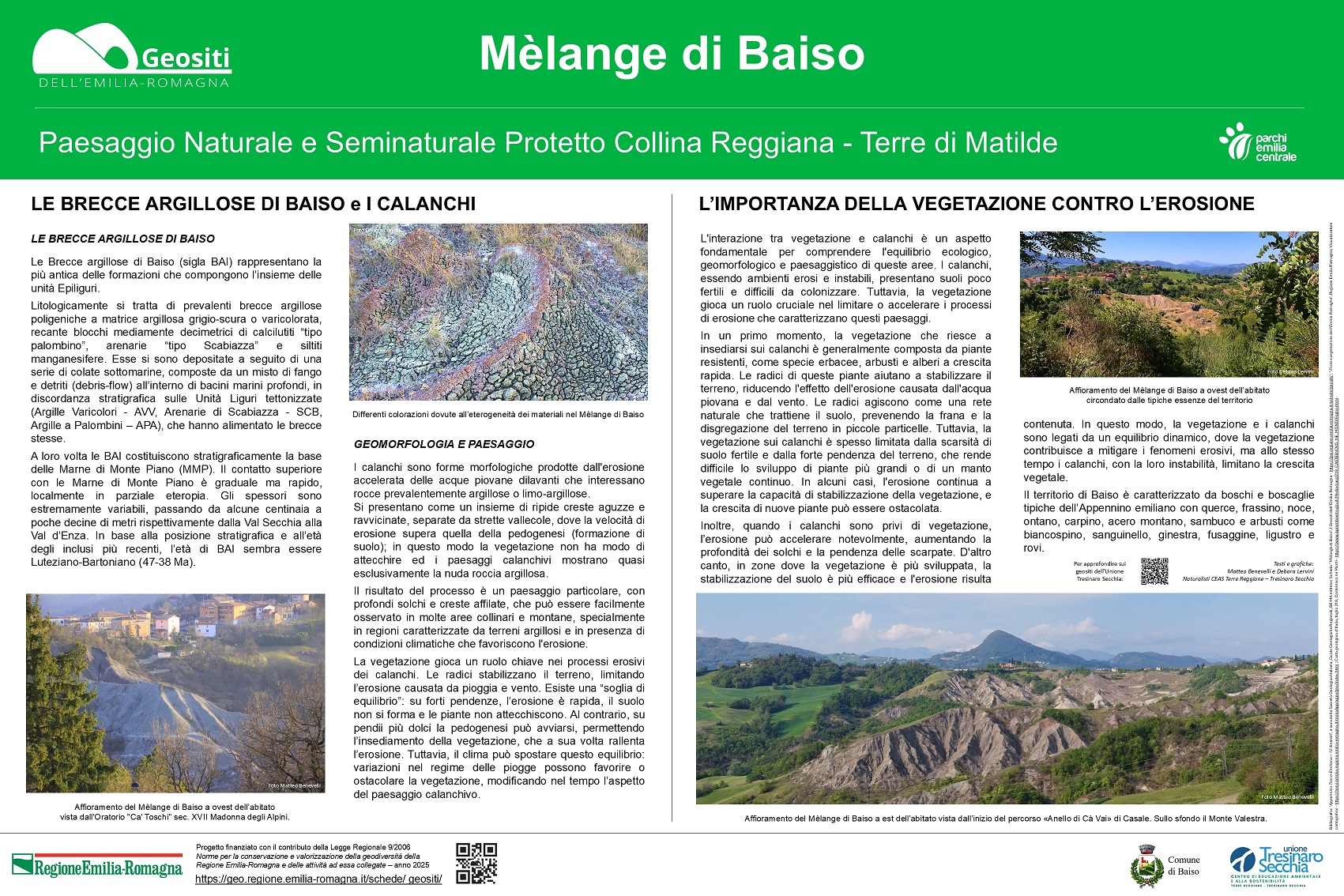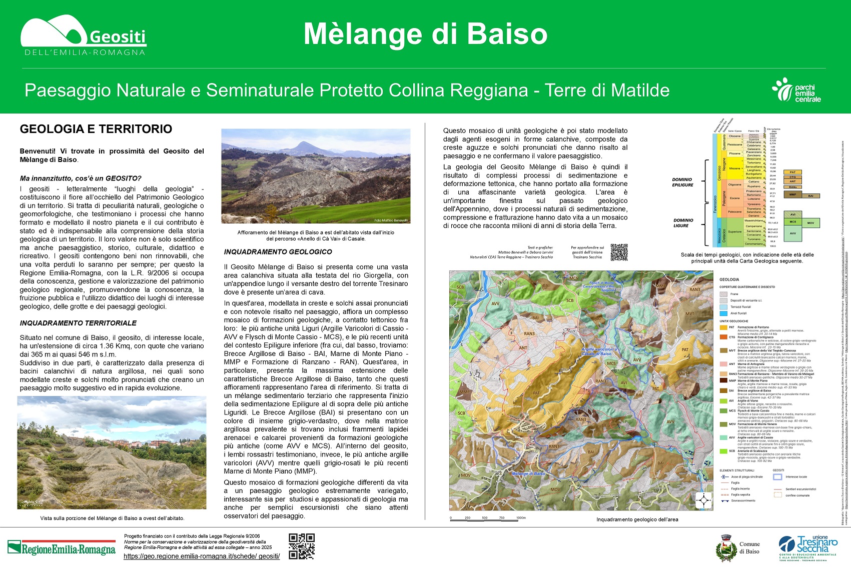 Il Geosito Mèlange di Baiso si presenta come una vasta area calanchiva situata alla testata del rio Giorgella, con un'appendice lungo il versante destro del torrente Tresinaro dove è presente un’area di cava.